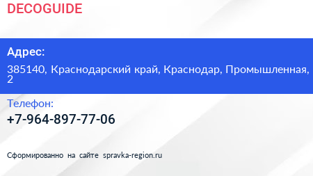 DECOGUIDE по адресу 385140, Краснодарский край, Краснодар, Промышленная, 2 в дальнейшем Организация, размещена в следующих категориях: