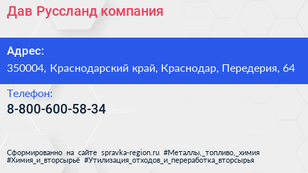 Дав-Руссланд, компания по адресу 350004, Краснодарский край, Краснодар, Передерия, 64 в дальнейшем Организация, размещена в следующих категориях: