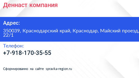 Деннаст, компания по адресу 350039, Краснодарский край, Краснодар, Майский проезд, 22/1 в дальнейшем Организация, размещена в следующих категориях: