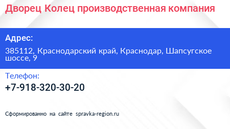 Дворец Колец, производственная компания по адресу 385112, Краснодарский край, Краснодар, Шапсугское шоссе, 9 в дальнейшем Организация, размещена в следующих категориях: