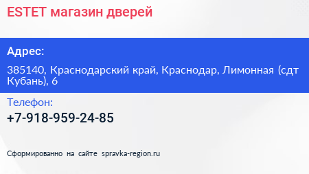 ESTET, магазин дверей по адресу 385140, Краснодарский край, Краснодар, Лимонная (сдт Кубань), 6 в дальнейшем Организация, размещена в следующих категориях: