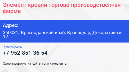 Элемент кровли, торгово-производственная фирма по адресу 350031, Краснодарский край, Краснодар, Декоративная, 12 в дальнейшем Организация, размещена в следующих категориях: