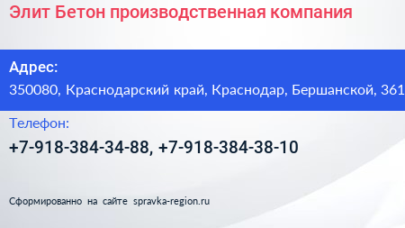 Элит Бетон, производственная компания по адресу 350080, Краснодарский край, Краснодар, Бершанской, 361 в дальнейшем Организация, размещена в следующих категориях: