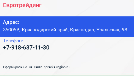 Евротрейдинг по адресу 350059, Краснодарский край, Краснодар, Уральская, 98 в дальнейшем Организация, размещена в следующих категориях: