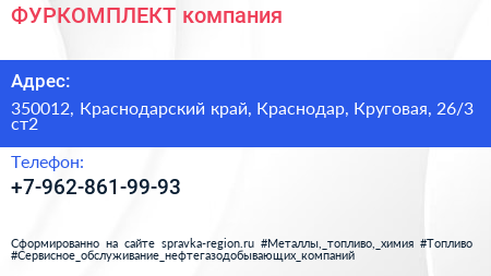 ФУРКОМПЛЕКТ, компания по адресу 350012, Краснодарский край, Краснодар, Круговая, 26/3 ст2 в дальнейшем Организация, размещена в следующих категориях: