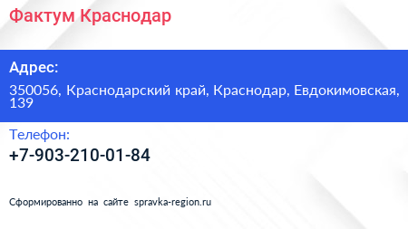 Фактум-Краснодар по адресу 350056, Краснодарский край, Краснодар, Евдокимовская, 139 в дальнейшем Организация, размещена в следующих категориях: