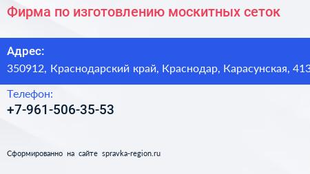 Фирма по изготовлению москитных сеток по адресу 350912, Краснодарский край, Краснодар, Карасунская, 413 в дальнейшем Организация, размещена в следующих категориях: