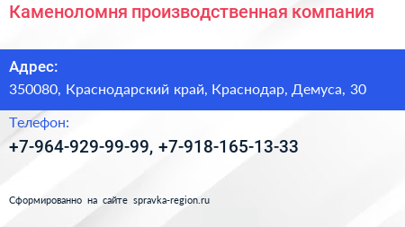Каменоломня, производственная компания по адресу 350080, Краснодарский край, Краснодар, Демуса, 30 в дальнейшем Организация, размещена в следующих категориях:
