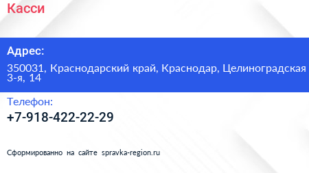 Касси по адресу 350031, Краснодарский край, Краснодар, Целиноградская 3-я, 14 в дальнейшем Организация, размещена в следующих категориях: