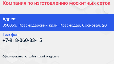 Компания по изготовлению москитных сеток по адресу 350053, Краснодарский край, Краснодар, Сосновая, 20 в дальнейшем Организация, размещена в следующих категориях: