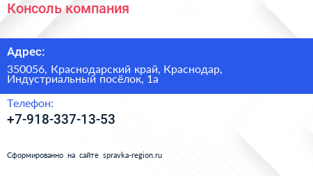 Консоль, компания по адресу 350056, Краснодарский край, Краснодар, Индустриальный посёлок, 1а в дальнейшем Организация, размещена в следующих категориях: