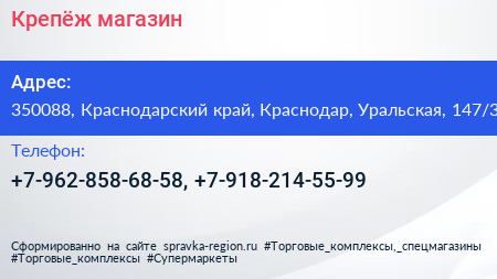 Крепёж, магазин по адресу 350088, Краснодарский край, Краснодар, Уральская, 147/3 в дальнейшем Организация, размещена в следующих категориях: