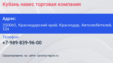 Кубань навес, торговая компания по адресу 350065, Краснодарский край, Краснодар, Автолюбителей, 12а в дальнейшем Организация, размещена в следующих категориях: