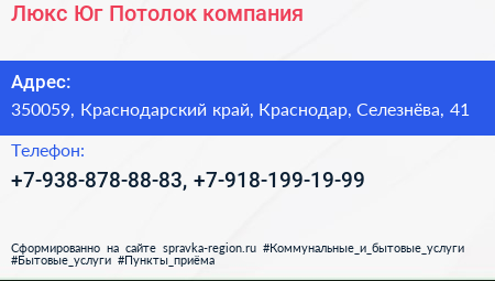 Люкс-Юг-Потолок, компания по адресу 350059, Краснодарский край, Краснодар, Селезнёва, 41 в дальнейшем Организация, размещена в следующих категориях: