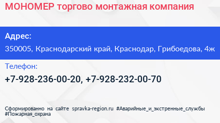 МОНОМЕР, торгово-монтажная компания по адресу 350005, Краснодарский край, Краснодар, Грибоедова, 4ж в дальнейшем Организация, размещена в следующих категориях: