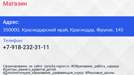 Магазин по адресу 350000, Краснодарский край, Краснодар, Фрунзе, 145 в дальнейшем Организация, размещена в следующих категориях:
