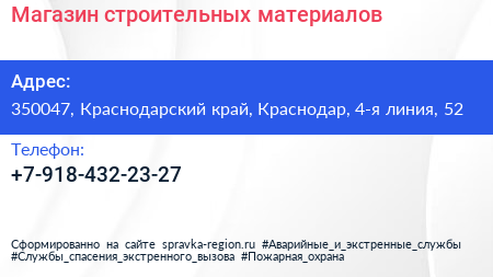 Магазин строительных материалов по адресу 350047, Краснодарский край, Краснодар, 4-я линия, 52 в дальнейшем Организация, размещена в следующих категориях: