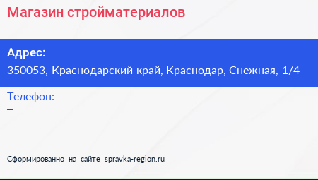 Магазин стройматериалов по адресу 350053, Краснодарский край, Краснодар, Снежная, 1/4 в дальнейшем Организация, размещена в следующих категориях: