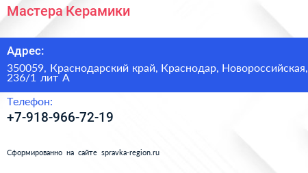 Мастера-Керамики по адресу 350059, Краснодарский край, Краснодар, Новороссийская, 236/1 лит А в дальнейшем Организация, размещена в следующих категориях: