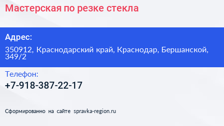 Мастерская по резке стекла по адресу 350912, Краснодарский край, Краснодар, Бершанской, 349/2 в дальнейшем Организация, размещена в следующих категориях: