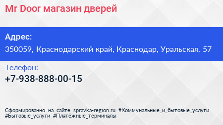 Mr.Door, магазин дверей по адресу 350059, Краснодарский край, Краснодар, Уральская, 57 в дальнейшем Организация, размещена в следующих категориях: