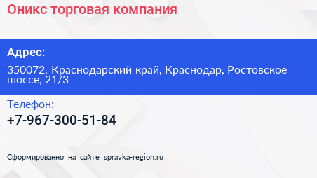 Оникс, торговая компания по адресу 350072, Краснодарский край, Краснодар, Ростовское шоссе, 21/3 в дальнейшем Организация, размещена в следующих категориях: