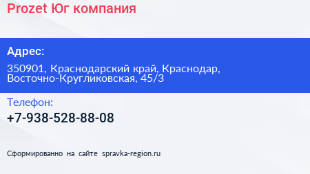 Prozet-Юг, компания по адресу 350901, Краснодарский край, Краснодар, Восточно-Кругликовская, 45/3 в дальнейшем Организация, размещена в следующих категориях: