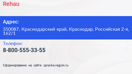 Rehau по адресу 350087, Краснодарский край, Краснодар, Российская 2-я, 162/1 в дальнейшем Организация, размещена в следующих категориях:
