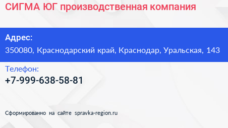 СИГМА-ЮГ, производственная компания по адресу 350080, Краснодарский край, Краснодар, Уральская, 143 в дальнейшем Организация, размещена в следующих категориях: