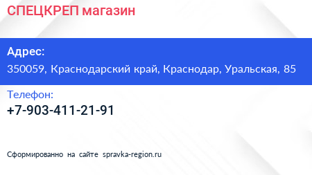 СПЕЦКРЕП, магазин по адресу 350059, Краснодарский край, Краснодар, Уральская, 85 в дальнейшем Организация, размещена в следующих категориях: