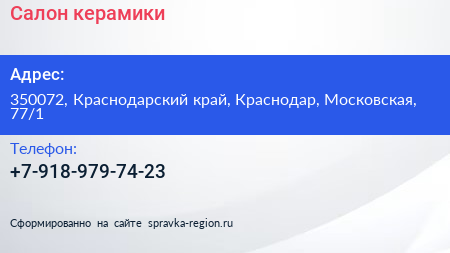 Салон керамики по адресу 350072, Краснодарский край, Краснодар, Московская, 77/1 в дальнейшем Организация, размещена в следующих категориях: