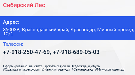 Сибирский Лес по адресу 350039, Краснодарский край, Краснодар, Мирный проезд, 10/1 в дальнейшем Организация, размещена в следующих категориях: