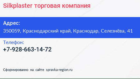 Silkplaster, торговая компания по адресу 350059, Краснодарский край, Краснодар, Селезнёва, 41 в дальнейшем Организация, размещена в следующих категориях: