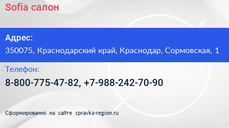 Sofia, салон по адресу 350075, Краснодарский край, Краснодар, Сормовская, 1 в дальнейшем Организация, размещена в следующих категориях: