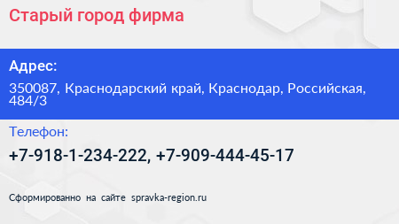 Старый город, фирма по адресу 350087, Краснодарский край, Краснодар, Российская, 484/3 в дальнейшем Организация, размещена в следующих категориях: