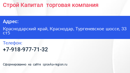 Строй-Капитал+, торговая компания по адресу Краснодарский край, Краснодар, Тургеневское шоссе, 33 ст5 в дальнейшем Организация, размещена в следующих категориях:
