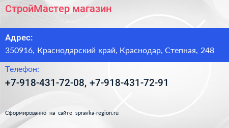 СтройМастер, магазин по адресу 350916, Краснодарский край, Краснодар, Степная, 248 в дальнейшем Организация, размещена в следующих категориях: