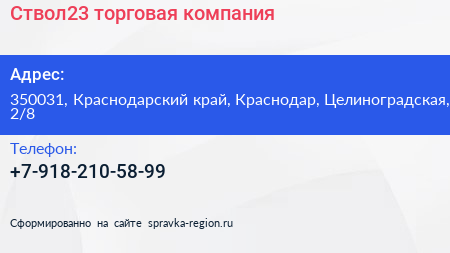 Ствол23, торговая компания по адресу 350031, Краснодарский край, Краснодар, Целиноградская, 2/8 в дальнейшем Организация, размещена в следующих категориях: