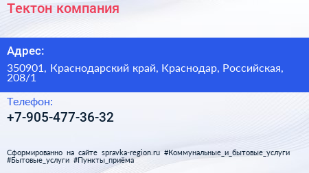Тектон, компания по адресу 350901, Краснодарский край, Краснодар, Российская, 208/1 в дальнейшем Организация, размещена в следующих категориях: