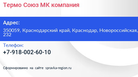 Термо Союз МК, компания по адресу 350059, Краснодарский край, Краснодар, Новороссийская, 232 в дальнейшем Организация, размещена в следующих категориях: