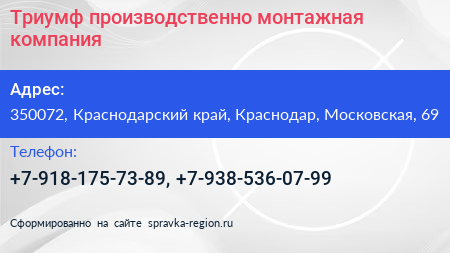 Триумф, производственно-монтажная компания по адресу 350072, Краснодарский край, Краснодар, Московская, 69 в дальнейшем Организация, размещена в следующих категориях: