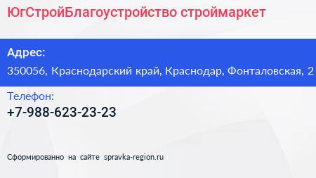 ЮгСтройБлагоустройство, строймаркет по адресу 350056, Краснодарский край, Краснодар, Фонталовская, 2 в дальнейшем Организация, размещена в следующих категориях: