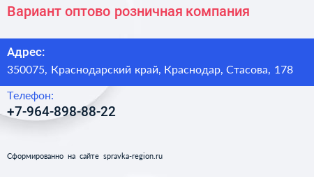 Вариант, оптово-розничная компания по адресу 350075, Краснодарский край, Краснодар, Стасова, 178 в дальнейшем Организация, размещена в следующих категориях: