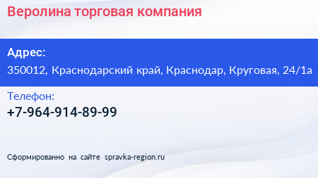 Веролина, торговая компания по адресу 350012, Краснодарский край, Краснодар, Круговая, 24/1а в дальнейшем Организация, размещена в следующих категориях: