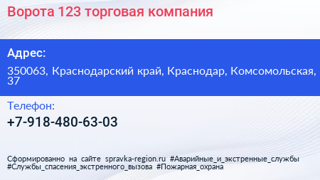 Ворота 123, торговая компания по адресу 350063, Краснодарский край, Краснодар, Комсомольская, 37 в дальнейшем Организация, размещена в следующих категориях: