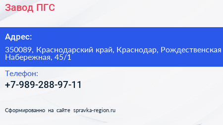 Завод ПГС по адресу 350089, Краснодарский край, Краснодар, Рождественская Набережная, 45/1 в дальнейшем Организация, размещена в следующих категориях: