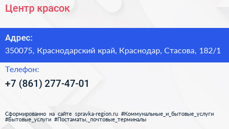 Центр красок по адресу 350075, Краснодарский край, Краснодар, Стасова, 182/1 в дальнейшем Организация, размещена в следующих категориях: