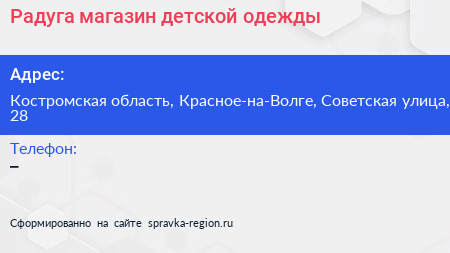 Радуга, магазин детской одежды по адресу Костромская область, Красное-на-Волге, Советская улица, 28 в дальнейшем Организация, размещена в следующих категориях: