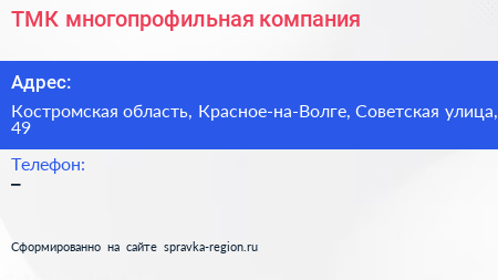 ТМК, многопрофильная компания по адресу Костромская область, Красное-на-Волге, Советская улица, 49 в дальнейшем Организация, размещена в следующих категориях: