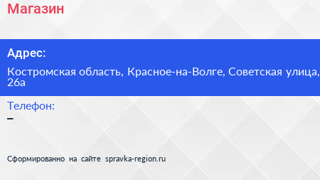 Магазин по адресу Костромская область, Красное-на-Волге, Советская улица, 26а в дальнейшем Организация, размещена в следующих категориях: